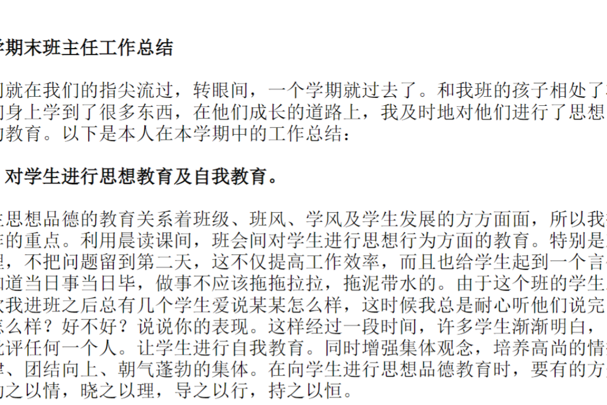 各位小学班主任们:每到期末,要全面、细致地总结一学期工作,常感千头万绪。本资料涵盖班级管理方面,如纪律维持、卫生状况;学生学业表现,包括成绩分析、学习态度变化;德育工作成果,像各类主题班会及品德教育活动的影响。还涉及家校合作的成效与问题反思。适合期末全面梳理工作,为下学期提供借鉴。文章有限,以下仅展示部分内容,点击下载按钮查看全部