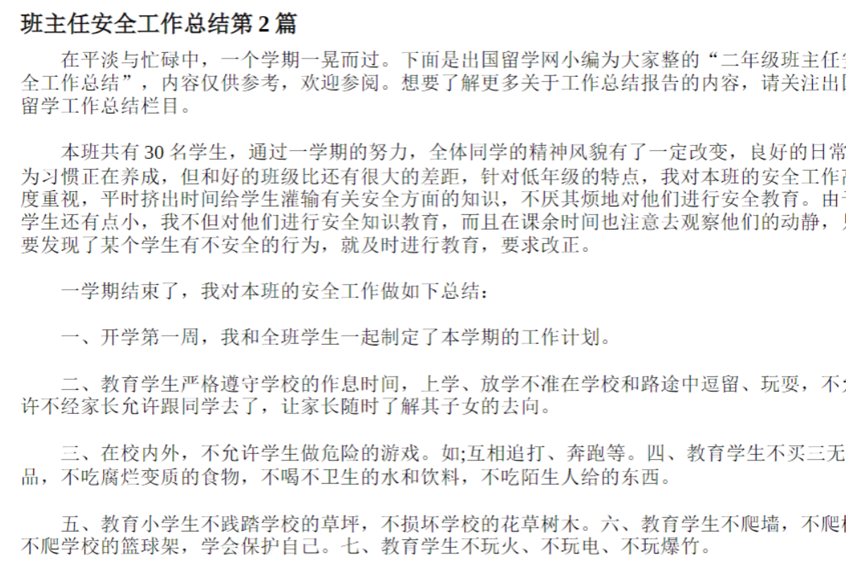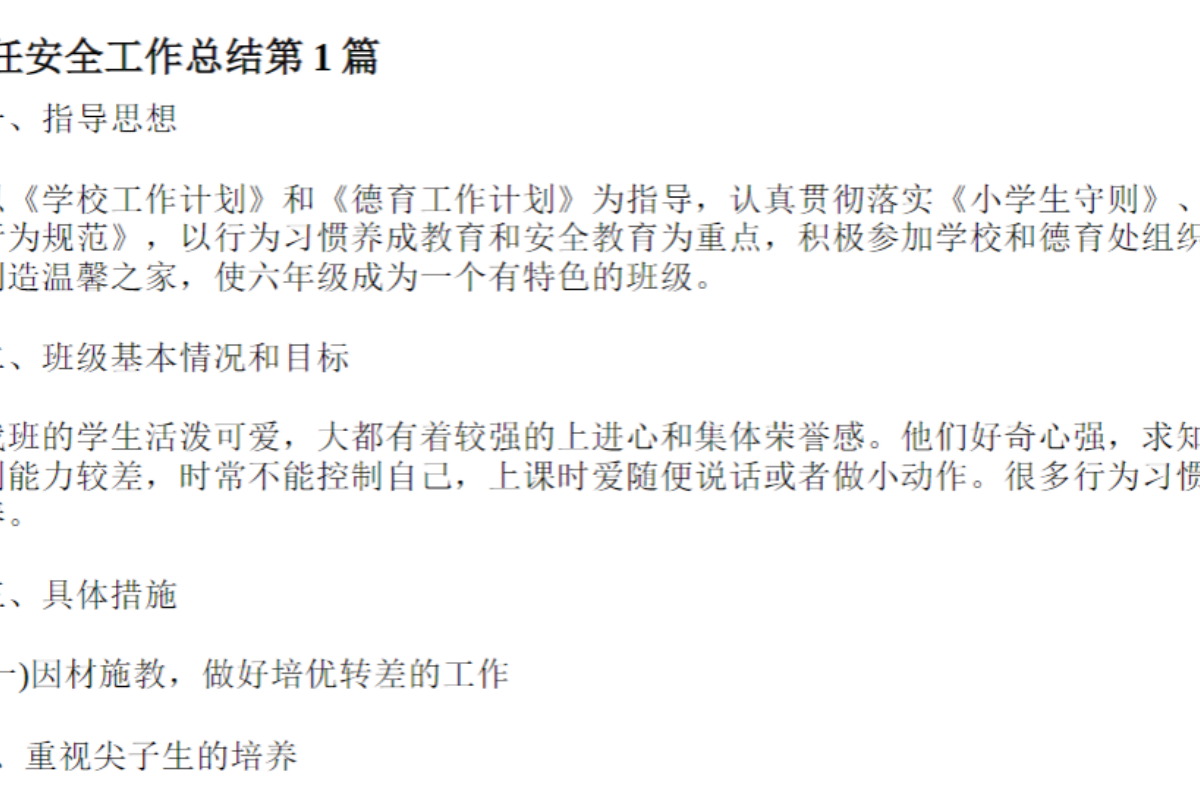 各位小学班主任们:校园安全至关重要,总结时需深入透彻。这 4 篇总结从日常安全教育活动开展、校园设施安全检查、应急演练效果评估等方面剖析。涉及交通安全、食品安全、课间活动安全等多个领域,助您深度反思安全工作,强化校园安全防线。文章有限,以下仅展示部分内容,点击下载按钮查看全部