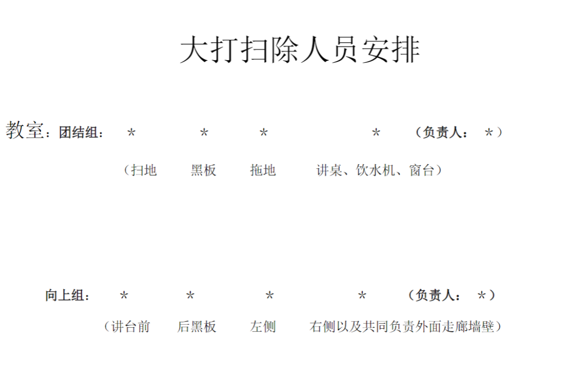 各位中小学,高中班主任们:组织大扫除时,合理安排人员常令人困扰。这份资料包含按区域划分的人员安排示例,如教室地面、窗户、黑板等,明确各区域负责人及成员。考虑到不同任务难度与工作量,优化人员配置,确保大扫除高效有序进行。适用于各类学校班级大扫除场景。文章有限,以下仅展示部分内容,点击下载按钮查看全部