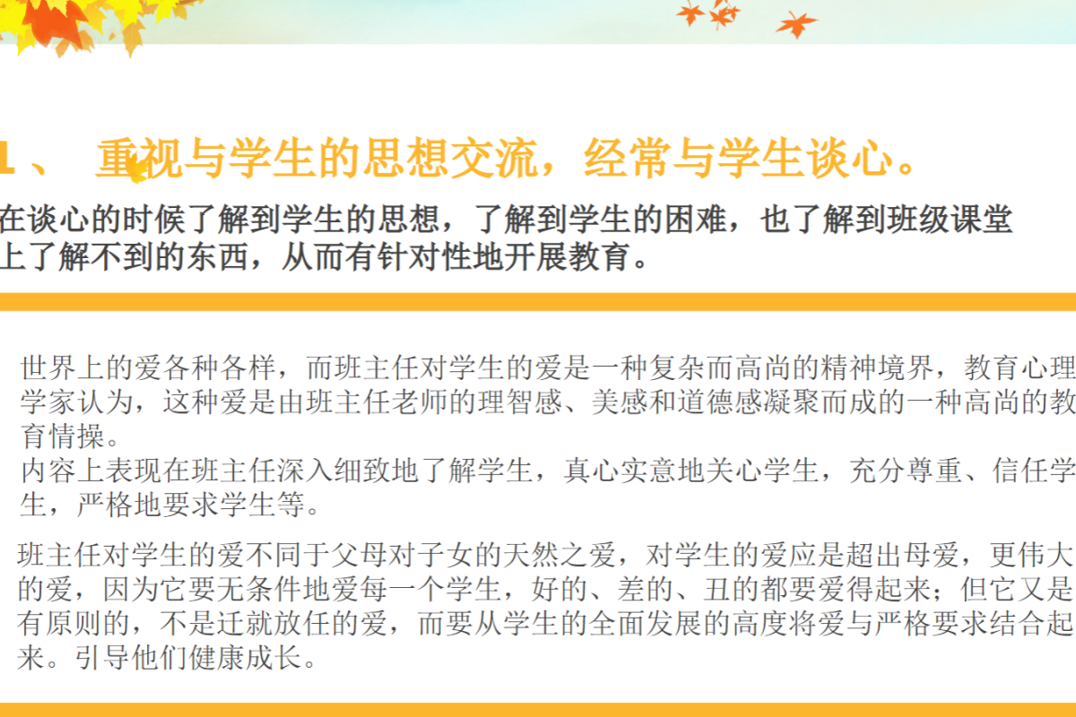 别担心,这款专为中小学班主任打造的班主任经验交流 PPT课件,聚焦“重视与学生的思想交流”核心主题,精准破解上述难题。作为深耕班主任教育资源领域的实用资料,该PPT系统梳理了师生思想交流的核心逻辑与实践方法,涵盖多个关键模块。其中,详细拆解了不同学段学生的思想特点与沟通技巧,比如与青春期学生的平等对话方式、倾听学生心声的有效策略;分享了思想交流场景的搭建方法,包括日常谈心时机的把握、主题式思想交流活动的设计;还包含了学生负面情绪疏导、价值观引导的实用路径。此外,课件融入大量一线班主任的真实沟通案例,搭配可直接套用的交流话术模板,所有内容均经过实践验证,简单易懂且可操作性强,是班主任开展思想教育工作、提升沟通能力的得力助手。