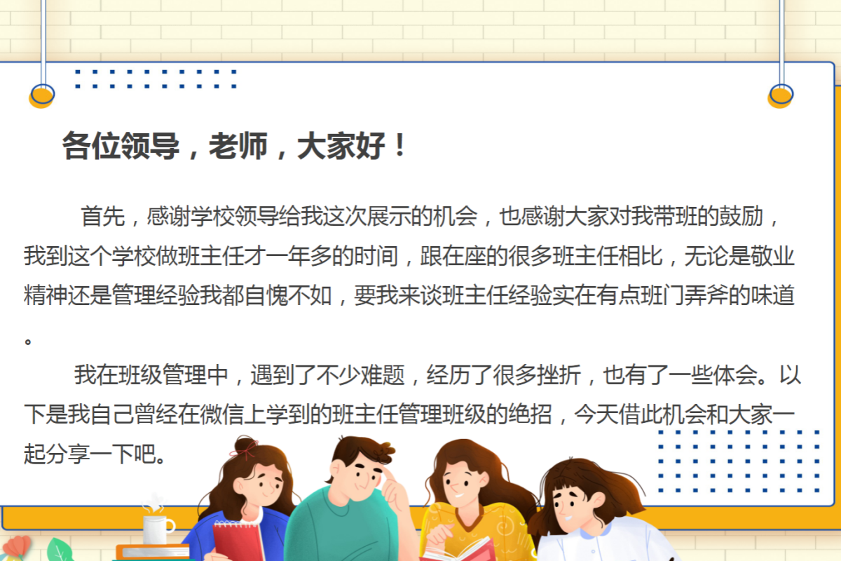 各位中小学班主任们,期望在班级推广阅读。此 PPT 分享阅读推广策略,如建立班级图书角、开展阅读分享会;介绍挑选适合学生年龄阶段书籍的方法;还讲解如何通过阅读活动培养学生阅读习惯,提高阅读理解与表达能力。文章有限,以下仅展示部分内容,点击下载按钮查看全部 声明:本站所有文章,如无特殊说明或标注,均为本站原创发布。任何个人或组织,在未征得本站同意时,禁止复制、盗用、采集、发布本站内容到任何网站、书籍等各类媒体平台。如若本站内容侵犯了原著者的合法权益,可联系我们进行处理。